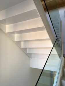 Questa è una scala in acciaio verniciato bianco, rivestita con legno di rovere e parapetto in vetro. Una scala qualsiasi sarebbe passata inosservata, questa creazione invece dona luce e trasparenza all’ambiente fondendosi perfettamente con lo stesso.