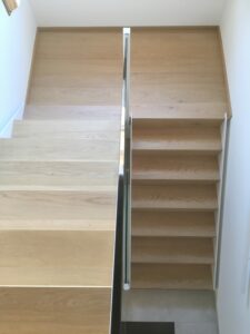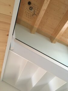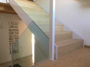 Questa è una scala in acciaio verniciato bianco, rivestita con legno di rovere e parapetto in vetro. Una scala qualsiasi sarebbe passata inosservata, questa creazione invece dona luce e trasparenza all’ambiente fondendosi perfettamente con lo stesso.