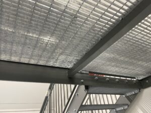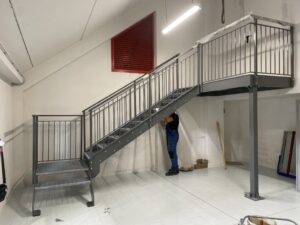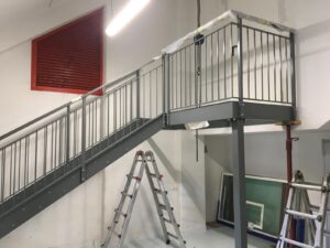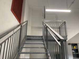 Qui TECOS ha progettato, costruito e montato la nuova scala : un’opera in acciaio verniciato costituita da fascioni in lamiera e gradini e pianerottoli in grigliato.